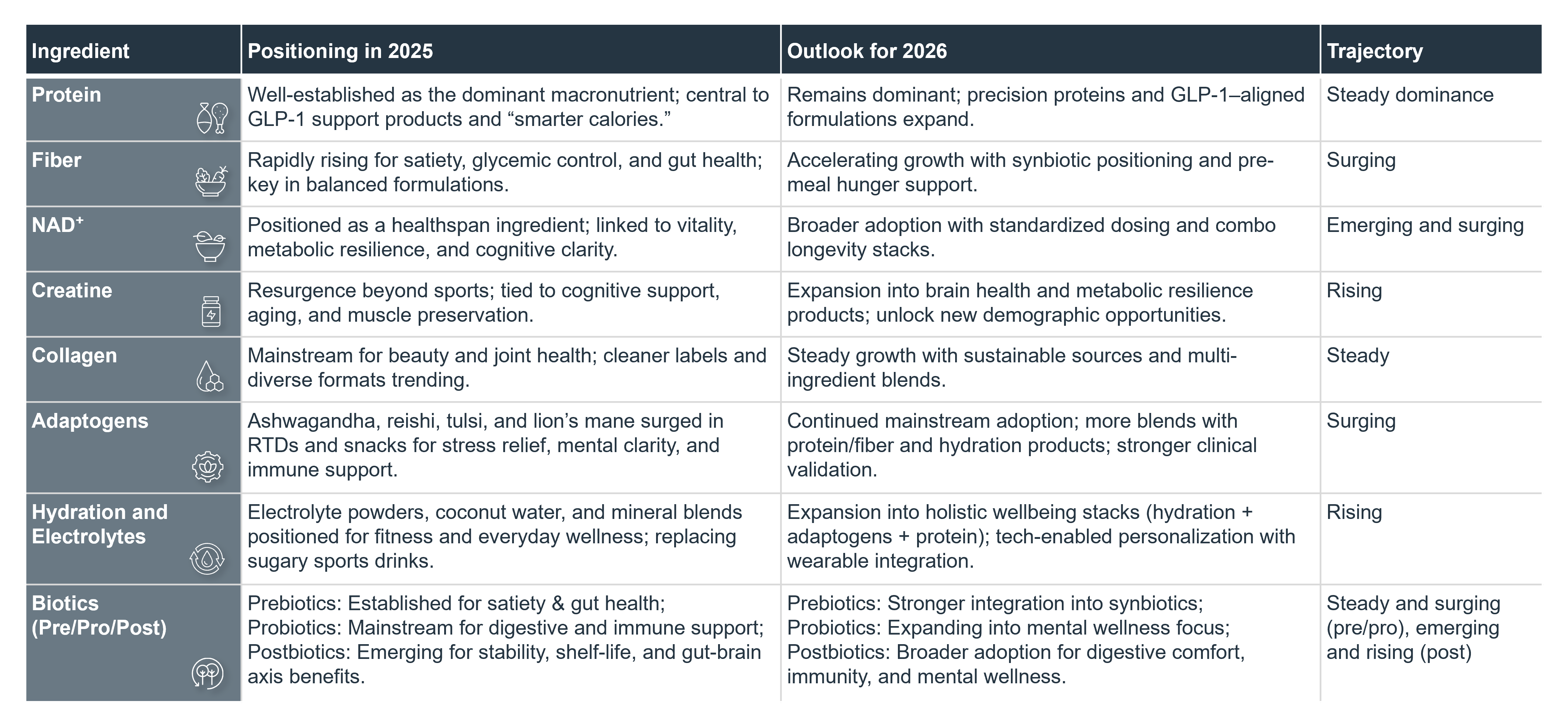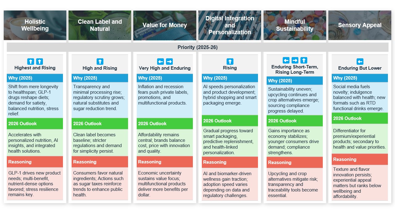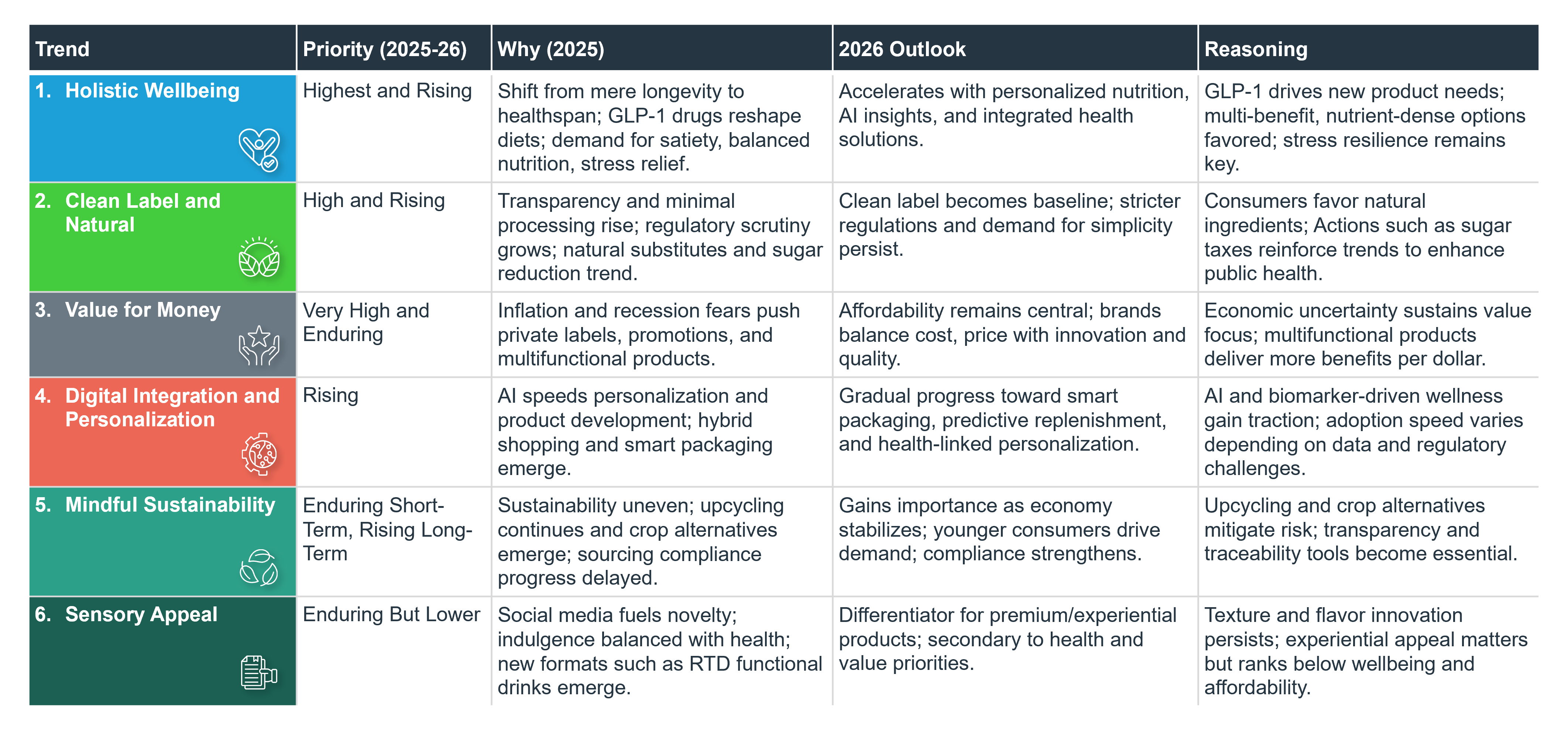 In 2026, the broad macrotrends shaping consumer behavior and industry priorities remain remarkably consistent with those observed in 2025, underscoring the enduring relevance of themes such as holistic health and wellness, value for money, and digitalization andpersonalization. Yet, beneath this steady surface, the sub–trends are actively migrating, reflecting both scientific advances and shifting consumer expectations.